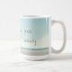 Commencez votre matinée avec cette tasse à café de 15 onces avec un paysage de plage avec des cairns au premier plan avec les mots personnalisables, "Joie, Paix, Mindfulness et sérénité.