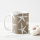 Aimez la plage ? Vous adorerez cette tasse d'étoiles de mer blanche et de plage portant votre nom personnalisé en écriture blanche ! L'arrière - plan est un faux dessin d'impression de burlap.