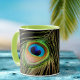 Tasse à café élégante avec une plume de paon glamour sur fond noir.