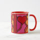 Quel Amusant ! Il y a juste quelque chose de si heureux et de si léger dans le design de cette grande tasse en céramique, qui rend impossible de ne pas sourire! L'oeuvre originale de Leslie Sigal Javorek est dans un style pop-art abstrait avec des coeurs rouge ketchup et des tons chauds et chauds de rose chaud, orange et noir contours contre porcelaine blanche vive.