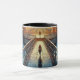 Un imaginaire de science-fiction à couper le souffle qui dépeint un être céleste majestueux avec des ailes rayonnantes descendant d'un portail divin de lumière. La scène est remplie d'architecture complexe, de symboles flottants et de colombes volantes, fusionnant des éléments futuristes et angéliques dans un paysage de rêve surréaliste. Un design parfait pour une tasse qui inspire l'imagination et l'émerveillement avec chaque gorgée!