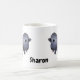 Poupée de chien créée au crochet. Bandes grises et blanches, yeux noirs, langue rose. Image du chien de chaque côté de la tasse faisant face au centre. Au centre inférieur, personnalisez un nom.