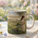 Célébrez la douceur du printemps avec cette délicate tasse pour enfants représentant une jeune fille tenant un doux lapin brun dans une prairie en fleurs. Remplie de marguerites, de primevères et de fleurs pastel, la scène capture la joie et le renouveau de Pâques dans un style doux et de conte de fées.