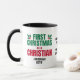 Élégant PREMIER NOËL EN NOUVEAU CHRÉTIEN Mug avec TEXTE ET DATE PERSONNALISABLE. Le design montre la typographie en sans serif verte et rouge de Noël avec des éléments saints rouges et verts. Un grand Mug festif pour un nouveau croyant chrétien. Vous pouvez PERSONNALISER LE TEXTE avec votre nom, vers biblique préféré, ou d'autres textes et année (ou supprimer). Idéal comme marchandise de Noël à l'église ou des cadeaux de proximité pour les nouveaux croyants célébrant leur premier Noël chrétien. Offres assorties disponibles.