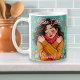 Une tasse à café fantaisiste à l'art populaire sucré avec une citation d'amour personnel et une illustration d'une fille qui se serre dans ses bras. Joli tableau aux tons turquoises, roses et oranges dans un style mignon et fantaisiste.