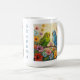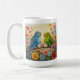 Cute personalized coffee mug for bird lovers with impasto painting style blue and green parakeets and flowers.