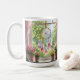 A gorgeous coffee mug with an ai illustration of a beautiful pink feathered dreamcatcher hanging in the window with a shelf of pink and white potted flowers under it, overlooking a yard full of Lucius green trees.