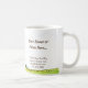Une promotion de la tasse personnelle avec nom ou société modifiable en lettres de caractères bruns, et un endroit pour votre adresse, site Web ou téléphone en lettres serif brunes et l'art vintage d'une ruche heureuse avec des abeilles bourdonnantes sur un paysage agricole pittoresque.