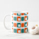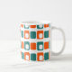 Cette tasse présente un design moderne du milieu du siècle avec des rectangles orange répétitifs et des rectangles blancs à l'intérieur alternant avec des rectangles turquoises.