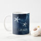 Cette tasse à café est composée d'un majestueux requin gris et blanc qui se promène chaque jour dans la mer d'un bleu profond, avec une étoile de mer et une place pour un nom sur sa gauche.