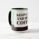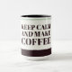 Une tasse à café avec un design qui dit : "Conserver le calme et faire du café". Ce design a été créé par Debbie Quick de Debs Creative Designs. www.debscreativedesigns.com