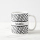 La surface de cette tasse est recouverte d'un motif noir et blanc rétro et branché avec des rangées d'ondes diagonales. À travers le centre se trouve un groupe blanc aux bords noirs. Un prénom a été ajouté sur cette bande aux deux côtés de la tasse. Vous pouvez ajouter votre nom à l'endroit où les espaces réservés s'affichent, écrire autre chose ou supprimer complètement les mots. La police peut aussi être changée en une autre si vous le souhaitez ! C'est génial de jouer avec ce design et de le faire vous-même. Personnaliser et éditer est amusant!