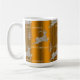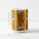 Une élégante tasse de Noël en or avec un motif de rennes de diamants scintillants. Les cerfs courent tous à travers un arrière - plan doré métallique très brillant, et il y a des salutations "Joyeux Noël" tout autour d'eux. Il y a aussi des arbres de Noël argentés disséminés un peu partout.