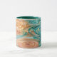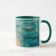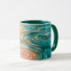 The image shows a close-up of water droplets creating ripples on a surface. The water is a mix of teal and orange hues, creating a visually appealing contrast. Several droplets are suspended mid-air, capturing the moment of impact. The ripples spread outwards in concentric circles, distorting the light and creating interesting patterns.