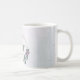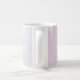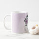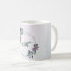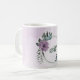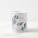 Tasse à café unique avec des fleurs violettes et bleues poussiéreuses romantiques et des feuilles vertes.