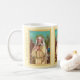 Dans cette jolie représentation tirée d'un dessin de dévotion, Saint Rose de Lima (1586-1617) se dresse dans un paysage tropical péruvien à la tombée de la nuit. Des petites étoiles jaunes scintillent dans le ciel bleu-vert foncé derrière elle. Elle est flanquée à gauche par une église en carton brun et à droite par un palmier balançant. Elle porte une couronne d’épines en souvenir de la passion du Christ sur son voile blanc, revêtue d’une habit dominicain crème qui lui convient parfaitement dans le Troisième Ordre. Elle tient une armure de roses roses roses et une croix en bois. + St Rose a été la première personne née dans les Amériques à être déclarée saint et reste populaire. Elle est le principal mécène du Pérou et des peuples indigènes d'Amérique Latine, co-protectrice des Philippines avec St. Pudentiana, protectrice des Amériques en général, et protectrice de Père Noël Rosa en Californie et de son diocèse. De plus, elle est la patronne des brodeurs, des jardiniers et des fleuristes. Naturellement, les roses de toutes les variétés sont devenus son attribut. Dans l'art, elle est peinte couronnée de roses, tenant des roses (comme ici), ou dans un décor de roses en pots ou de buissons roses fleuris. + Fête : 23 août + Crédit image (M 024) : Image antique de Saint Rose de Lima d'un chromolithographe dévotionnel imprimé en Allemagne, éditeur original inconnu, fin du 19ème au début du 20ème siècle, de la collection privée de l'architecte de l'éphémère religieux. + Vous préférez un autre arrière - plan de couleur ? La carte postale Palette de couleurs de cette image fournit des teintes de coordination suggérées. Les cartes postales Color Palette se trouvent dans la COLLECTION associée à une image et dans la COLLECTION spéciale consacrée uniquement aux palettes de couleurs.