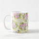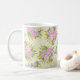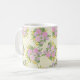 Cette tasse est décorée de roses roses, de roses sauvages violets et de fleurs jaunes en forme d'étoile sur un arrière - plan crème et jaune texturé avec le motif gras de grand-mère.