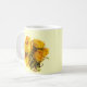 Cette jolie tasse présente une composition en natures mortes de roses séchés exquis sur un arrière - plan jaune. Les pétales sont de couleur allant du jaune pâle à l'or en passant par un abricot orange profond. L'image est répétée à droite et à gauche.