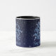 Mug avec le symbole zodiaque pour Sagittarius en bleu argenté doux, recouvert d'étoiles de la constellation, contre un arrière - plan étoilé du bleu profond de minuit au noir
