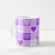 Cette tasse présente un motif de coeurs courbés sur des échiquiers dans les tons violets, violets, lavande et lilas, parfait pour la Saint-Valentin ou n'importe quel jour de l'année.