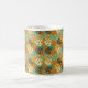 Cette tasse a un design moderne du milieu du siècle d'un adaptateur d'enregistrement qui se superpose partout en tan, blanc cassé, marron, orange, turquoise, bleu et vert.