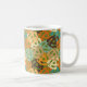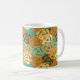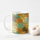 Cette tasse a un design moderne du milieu du siècle d'un adaptateur d'enregistrement qui se superpose partout en tan, blanc cassé, marron, orange, turquoise, bleu et vert.