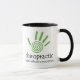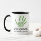 Cette tasse de chiropractie comporte une copie et un texte en spirale verts de main qui indique la "chiropractie - santé sans prescription."