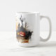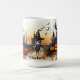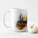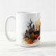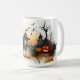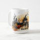 Une mignonne petite sorcière dans un énorme casquette se dresse au milieu des jack-o-lanternes tandis que des chauves-souris survolent cette mignonne et amusante tasse à café Halloween.
