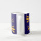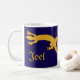 geckoes dorés interconnectés en silhouette. Tout le monde a besoin d'un gecko ou de deux. Design unique Inkshed. Geckoes jaunes dorés, tasse violet foncé/bleu. Modifiez le nom pour personnaliser, ou supprimez-le simplement pour un cadeau simple et élégant.