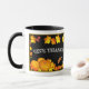 Une belle tasse lumineuse avec des légumes de saison, des citrouilles et des pommes, le feuillage de chute, le tournesol, le papillon et la Bible ouverte, avec les mots du Psaume 106:1 et les mots "DONNEZ MERCI" sur le dos. Un beau cadeau de saison !