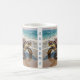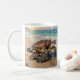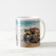 A coastal themed personalized coffee mug with an illustration of a mama sea turtle and baby crawling into the blue ocean waves on a sandy beach. Just add a name or family member such as "grandma" in the personalize area.