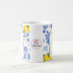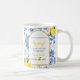 The She Found Her Main Squeeze bridal shower coffee mug features blue flowers, yellow lemons, and black and yellow text.