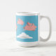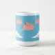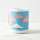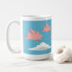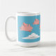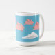 Une tasse dépeignant des porcs volant au-dessus des nuages blancs contre un ciel bleu.