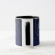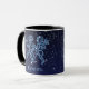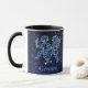Mug avec le symbole zodiaque pour Gemini en bleu argenté doux, recouvert d'étoiles de la constellation, contre un arrière - plan étoilé du bleu profond de minuit au noir