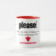 Gardez ces gens agaçants à distance avec cette tasse de café qui dit : S'il vous plaît ! Ne pensez même pas à me parler tant que le niveau de café n'est pas là. Il y a une grande flèche rouge pointant vers une ligne près du bas de la tasse. Vous pouvez le personnaliser avec votre nom dans le coin par la poignée. Le texte est noir, la flèche et la ligne sont rouges et la tasse est blanche avec un rouge à l'intérieur et une poignée rouge.