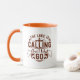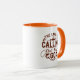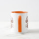 The bold design is printed on a crisp white ceramic base, complemented by a vibrant orange handle and inner color for a bright, energetic touch.