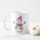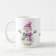 Ce mignon bonhomme de neige portant une écharpe violette, rose et verte, tricot beanie, et mittens fait de cette simple tasse l'accessoire parfait à votre fête de vacances ou petit déjeuner familial. Joyeux sentiment de Noël peut être changé. L'IA a aidé graphisme acheté à des fins commerciales.