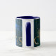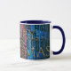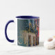 Une tasse à café de Noël classique et colorée avec une scène de ville bleu et rouge enneigée avec un texte souhaitant un très "Joyeux Noël !" à tous.