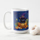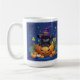 Cette tasse classique en céramique a un chaton noir mignon avec son propre petit casquette sorcier dans une éffrayante citrouille sculptée jack-o-lanterne. Berries, toile d'araignée et ciel étoilé sont l'arrière - plan. Le texte qui apparaît à l'arrière de la tasse peut être personnalisé à votre propre message ou nom.
