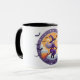 Cette tasse à thème personnalisable "Halloween" présente une mignonne sorcière volant sur son broomstick avec un texte que vous pouvez personnaliser.