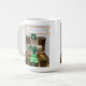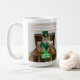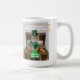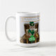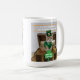 A St Patrick Day's Mug with Cat Generated Content and Humor Text, the cat is dressed like a leprechaun and sit on a gold treasure. a cute funny gift for Cat Lovers and Cat Owners.