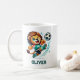 Cette tasse personnalisée pour enfants amusante et énergique présente un lion joyeux jouant au football. Le lion porte un maillot de foot et un short ludiques aux rouges et verts vibrants.