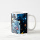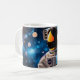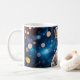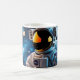 Glossy white mug featuring a vivid close-up of a NASA-style astronaut; gold visor reflecting stars with a blue, bokeh space backdrop.