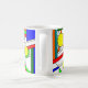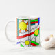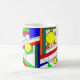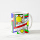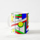 Cette tasse a un design moderne du milieu du siècle d'un look de vitrail avec des lignes noires et des cercles remplis de couleurs primaires et secondaires.