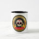 Sugar skull in the center of a circle of small black with white skulls and three yellow burning candles. "This is from the Day of the Dead know as Dia de los Muertos sugar skulls .