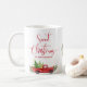 Customisez cette belle tasse de Noël avec votre propre texte en bas, ajoutez le nom de famille ou tout ce que vous voulez! Design avec l'attrayante phrase "Sweet Christmas" en écriture manuscrite rouge typographie de script. Ci-dessous magnifique aquarelle vieille mode vintage camion rouge transportant des arbres de Noël sur le dos. Au centre petit détail avec des vacances verdoyantes vieilles bouilloire et sucre de canne rouge. Tons vert, rouge et blanc. Grand cadeau de vacances unique à chérir! Collection avec les produits de coordination disponibles.