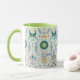Œuvre d'art céleste boho chic vibrante présentant des symboles solaires, des lunes, des plumes et des éléments botaniques complexes dans des tons sarcelle, or, magenta et aqua.
