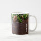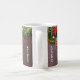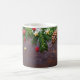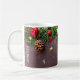 Une tasse avec une photo rustique d'une table en bois marron avec des pinecones, des aiguilles de pin, de la neige et des ornements de Noël. Festif et adorable.