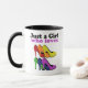 Colorée talons hauts, cette conception présente des talons hauts colorés et un texte disant "Juste une fille qui aime les talons".