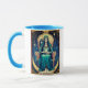 Mug in "The High Priestess", a tarot archetype, seated on an ornate throne, holding a glowing crystal. She wears an intricate headdress adorned with golden accents. An owl, symbolizing wisdom, perches beside her.